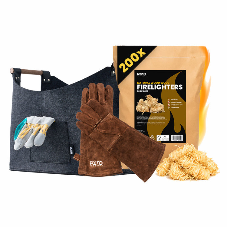 Steek veilig aan, bescherm je handen en houd je haardhout netjes georganiseerd.
